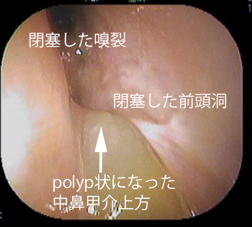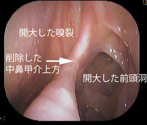 写真でお示ししたように中鼻甲介上方を切除した症例ではその部位が大きく開放されて嗅裂も前頭洞も開大しています。