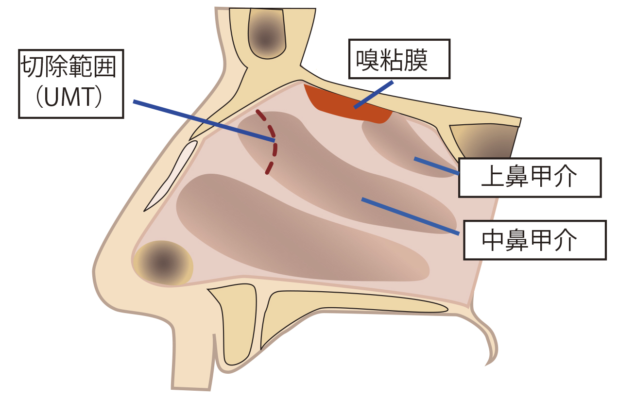 現在慢性副鼻腔炎の約半分は好酸球炎症が主原因となる好酸球性副鼻腔炎という疾患です。この疾患の詳細はHPの「診療案内」→「好酸球性副鼻腔炎」で示していますのでご参照頂ければ幸いですが、好酸球性副鼻腔炎は再発しやすいこと、しかも再発する場合は中鼻甲介上方の前頭洞から前頭窩にかけて、また嗅裂近辺に再発しやすい傾向があり、それゆえに前頭部痛や嗅覚障害が起こりやすい事が知られています。それを少しでも予防するために中鼻甲介の上方一部をあらかじめ削っておいて、そのあたりが狭くならないようにする事で再発率を抑える事ができるかという検討です。(下図の切除範囲)